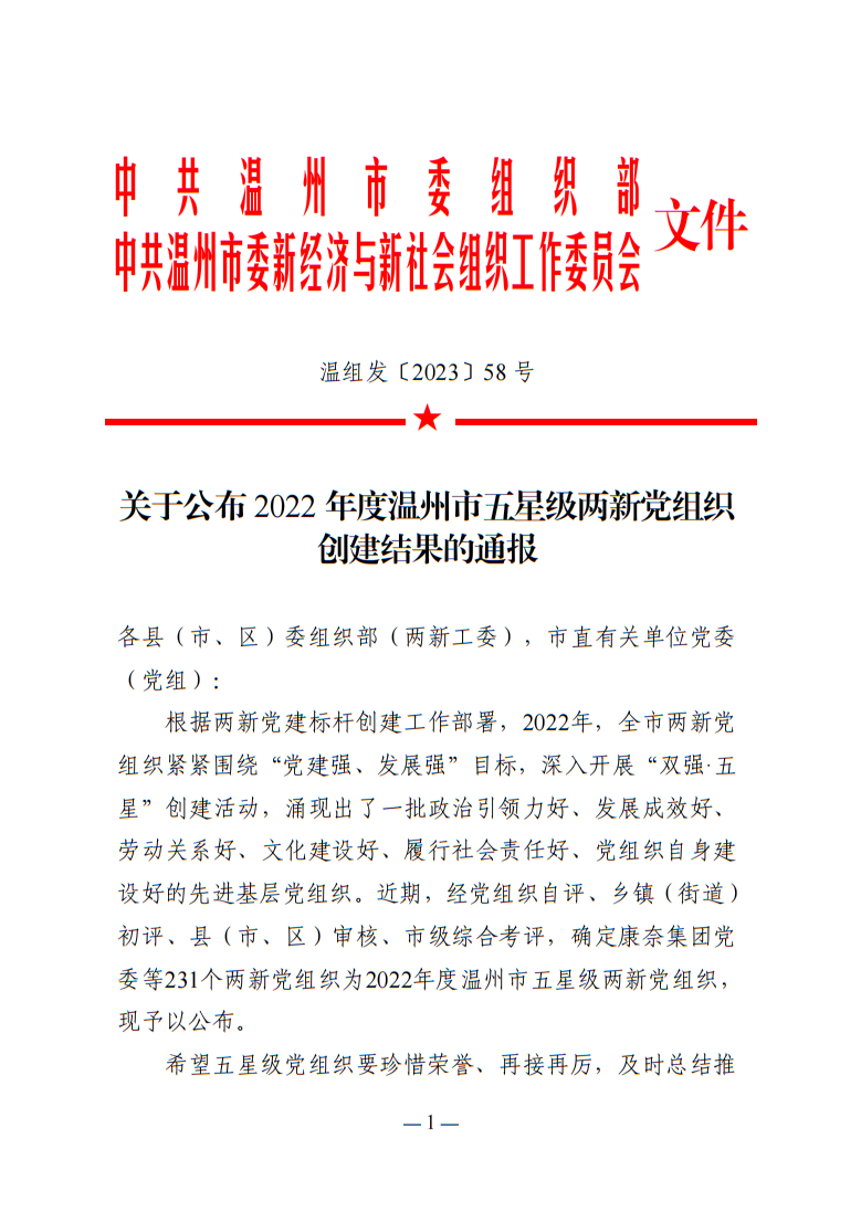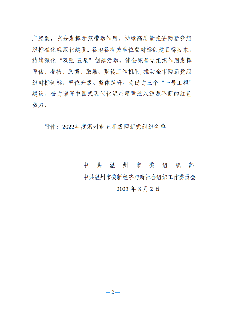 關于公布2022年度溫州市五星級兩新黨組織創建結果的通報